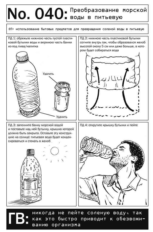 В море вода повсюду, но пить ее нельзя. Употребляя соленую воду, вы умрете еще быстрее, чем вовсе без воды. Однако с помощью перочинного ножа или бритвы и парочки предметов, которые легко найти, вы можете создать импровизированную систему опреснения воды, которая использует самый распространенный в море ресурс.