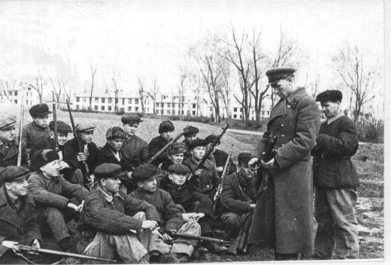Лейтенант НКВД обучает бойцов истребительного батальона обращению с оружием. Тула 1941