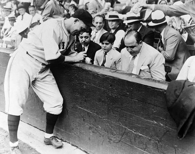 Профессиональный бейсболист Габби Хартнетт дает автограф Сонни Капоне, сыну Аль Капоне, на благотворительном бейсбольном матче на стадионе «Комиски парк». Чикаго 9 сентября 1931 года.