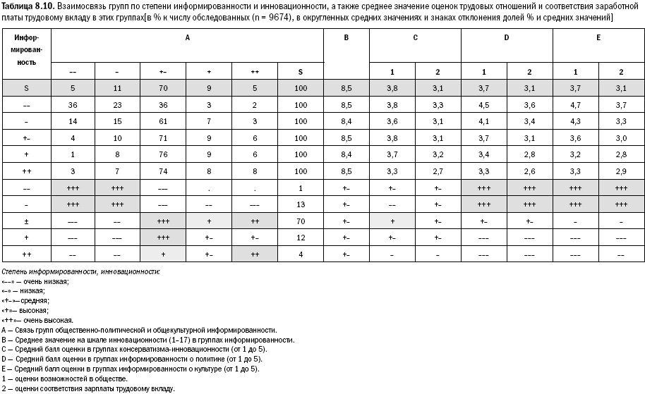 Иная, контрастная и яркая картина перепадов оценок отношений в трудовой сфере в группах по общественно-политической и общекультурной информированности. Очень низко и низкоинформированные группы демонстрируют высокие оценки (между «4» и «5») возможностей в трудовой сфере и выше средних (между «3» и «4») по соответствию заработной платы трудовому вкладу (отклонения значимы в 95 % доверительном интервале). В прямую противоположность этому очень высоко и высокоинформированные группы демонстрируют ниже среднего оценки (между «3» и «4» при средней 3,7 и ближе к «тройке») возможностей в трудовой сфере и ниже тройки (между «2» и «3», ближе к «тройке») по соответствию заработной платы трудовому вкладу (отклонения на минус значимы в 95 % доверительном интервале). При этом общественно-политическая информированность дает более сбалансированную и резкую картину перепадов, чем общекультурная (сравни знаки отклонений в разделах D и E табл. 8.10).