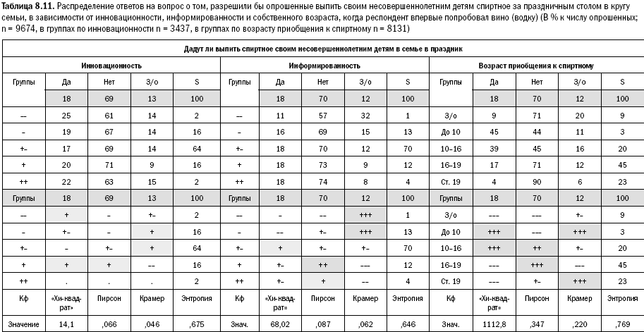 Очень характерно распределение ответов на вопрос о возможности дать выпить спиртное своим несовершеннолетним детям за праздничным столом. Рассмотренное в группах по инновационным предрасположенностям, общественно-политической информированности и возрасту приобщения к спиртному, оно дает совершенно очевидный результат. Закрепляемые определенными формами поведения «смыслы» существуют в поддерживаемых социальными условиями нормах поведения и детерминируют передачу этих норм последующим поколениям более эффективно, чем сконструированные по «поодаль лежащим» предметностям признаки сознания.