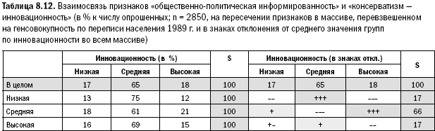 Как видно, взаимная сопряженность двух типов информированности (общественно-политической и общекультурной) достаточно высока. При «хи-квадрате» 564,285 (доверительный интервал 99,95 %) коэффициенты взаимосвязи составляют: Пирсон – 0,245, Крамер – 0,123, взаимной сопряженности – 0,238, а значение нормированной энтропии – 0,597. Даже на массиве в 9379 человек (взятых на пересечении признаков) отклонения в группе объемом в 1 % с очень низкой степенью общественно-политической информированности по высоким степеням общекультурной информированности нерепрезентативны (знак «.» фиксирует объемы в 2 – 3 человека). Таким образом, общественно-политическая и общекультурная информированности связаны между собой напрямую, но не очень резко (диагональное распределение отклонений от средней на плюс в правом нижнем углу снижается по доверительному интервалу). А вот признак «консерватизма – инновационности» нейтрален по отношению к признаку «степень общественно-политической информированности». В табл. 8.10 (B) мы видим, что среднее значение «гауссианны» инновационности не имеет значимых отклонений ни в одной из групп по степени общественно-политической информированности (отклонения лишь в 0,1 от общей средней величины, т. е. 1 % от 100 %).