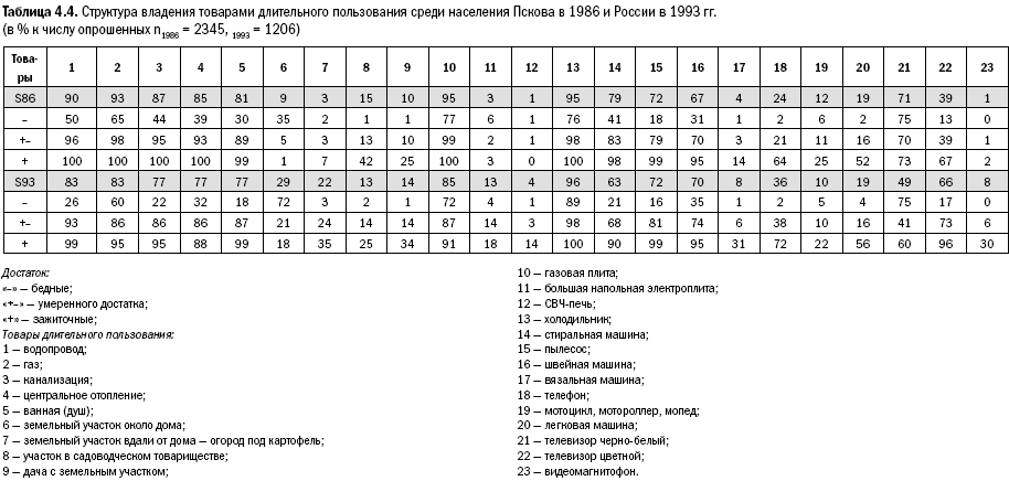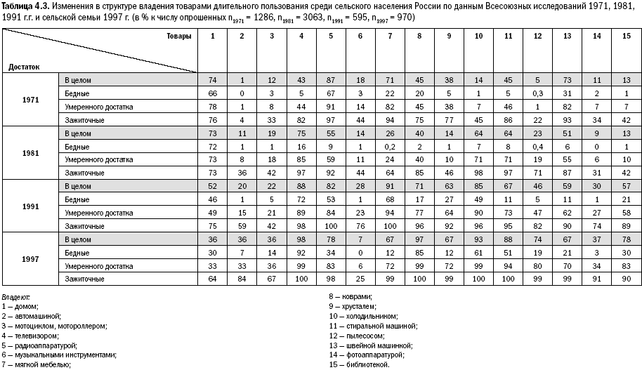 В 1997 г. М. Г. Панкратова провела Всероссийское исследование сельских семей с детьми. Я помогал ей его обрабатывать и анализировать. Конечно, выборка ее исследования имела дело с достаточно благополучным слоем сельчан, поднимавшимся в те годы до обвала бесценных государственных казначейских обязательств. Но в табл. 4.2 и 4.3 слои «бедных», «середняков» и «зажиточных» были сконструированы на основе перечня вещей из ее исследования.