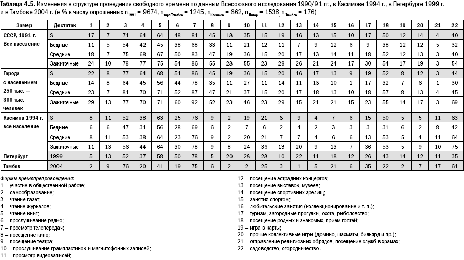 Изменения в предметной структуре бытовой микросреды сопровождались в этот период не менее интенсивными изменениями в сфере проведения свободного времени (табл. 4.5). Фактически мы видели на графиках активности в проведении досуга на возрастной шкале меньше всего изменений. Однако, это количественный показатель. Обратимся к конкретным формам «досуга».