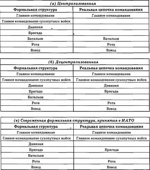 Армии разделены на традиционные подразделения, с вариациями в различных странах: дивизии, бригады, полки, батальоны, роты, взводы. Однако центр принятия решений и реальная организационная структура обычно сконцентрированы на одном или двух конкретных уровнях. Для нас очень важно выявить решающий уровень, а затем направить на него все усилия. Таблица I показывает некоторые альтернативы, с которыми мы можем столкнуться, хотя на самом деле для того, чтобы достичь глубокого проникновения, нам придётся оперировать на нескольких уровнях ниже реального центра принятия решений; оперировать выше не имеет смысла.