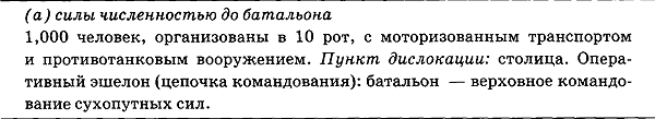 Наше первоначальное исследование вооружённых сил в стране, выбранной мишенью для переворота, выявило две категории сведений, ключевых с точки зрения планирования переворота. Речь идёт о виде и составе частей, способных вмешаться в события, и реальном оперативном эшелоне командования внутри них. Эти данные иллюстрирует приводимая ниже наглядная таблица:
