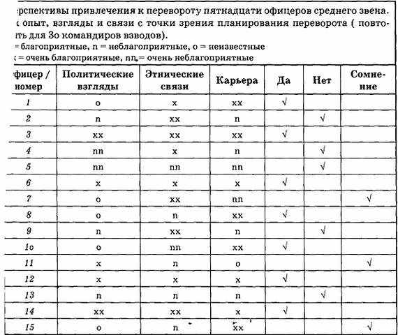 Чтобы привлечь то или иное подразделение к участию в перевороте, необходимо заручиться активным сотрудничеством ряда его «лидеров». В случае технически простых подразделений отпадение некоторых технических специалистов не составит для нас большой проблемы. Если же в достаточно «подготовленных» к участию в перевороте подразделениях некоторые «лидеры» останутся лояльными прежнему режиму, это не станет серьёзным препятствием[50].