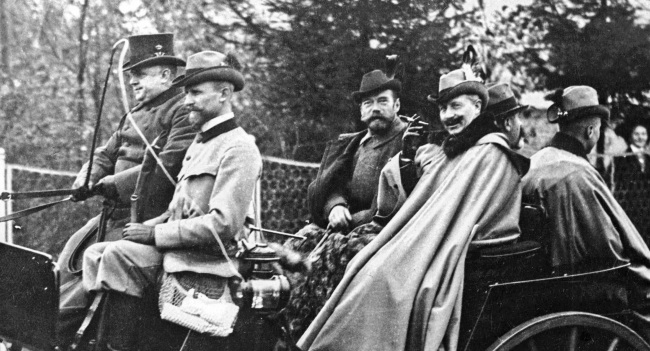 Похороны короля Эдуарда VII, Виндзорский замок, 1910 г. Сверху (слева направо): король Норвегии Хокон VII, царь Болгарии Фердинанд I, король Португалии Мануэл II, кайзер Германии Вильгельм II, король Греции Георг I, король Бельгии Альберт I. Снизу: король Испании Альфонсо XIII, король Англии Георг V, король Дании Фредерик VIII.
