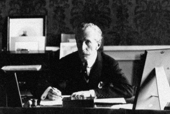 Чрезвычайный и полномочный посол Великобритании в России (1910–1918 гг.) сэр Джордж Уильям Бьюкенен за письменным столом в британском посольстве, 1914 г.