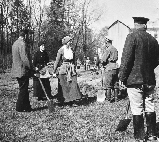 Дочь Николая II Татьяна с фрейлиной Анастасией Гендриковой в огороде у Александровского дворца в Царском Cеле, апрель 1917 г.