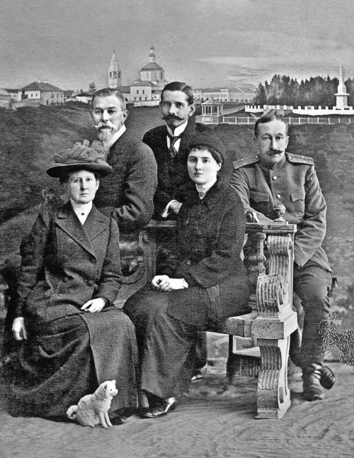 Приближенные, сопровождавшие царскую семью в Тобольск. Сидят: Е.А. Шнейдер и графиня А.В. Гендрикова, стоят: граф И.Л. Татищев, П. Жильяр, князь В.А. Долгоруков.
