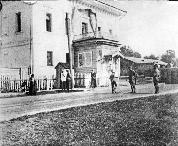 Смена караула перед губернаторским домом. На балконе – великие княжны Мария и Анастасия. Тобольск, 1917 г.