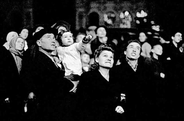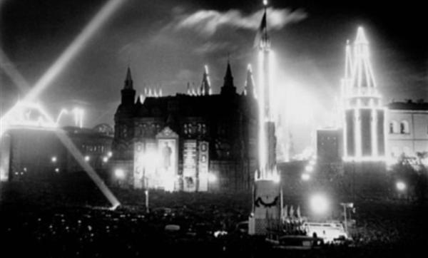 Москва пребывала в состоянии лихорадочной деятельности. Многочисленные бригады развешивали на зданиях гигантские плакаты и портреты национальных героев – они занимали целые акры. Мосты обрамляли гирлянды электрических лампочек. Кремлевские башни, стены и даже зубцы стен тоже были усыпаны лампочками. Каждое общественное здание подсвечивалось прожекторами. На всех площадях были сооружены танцевальные площадки, а кое-где стояли маленькие киоски, похожие на сказочные русские домики – здесь продавали сладости, мороженое и сувениры. К этому событию централизованно выпустили памятную медаль на колодке, и многие носили ее.
