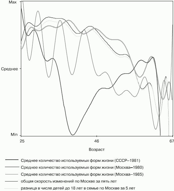 1. Надежность данных. Коэффициент корреляции рангов Пирсона равен +0,919 по волне возрастной активности СССР в 1981 г. и Москве 1985 г. (кривые 1 и 3). Он же составляет +0,868 по волнам возрастной активности москвичей 1980 и 1985 гг. (кривые 2 и 3) и +0,701 по волне скорости изменений за 5 лет и конечной активности москвичей (кривые 4 и 3). Волна стартовой активности дает коэффициент взаимной сопряженности с волной изменений +0,265 (кривые 4 и 2). Таким образом, как и в случае с ценностями при внешней стабильности структуры, все движется к конечным точкам движения, которые стимулируют его (волна движения коррелирует с конечным, а не исходным пунктом при тождественности структур обоих пунктов). Совпадение волн возрастной активности в Москве 1985 г. и СССР 1981 г., высокая корреляция волны изменений в Москве к 1985 г. с возрастной активностью по СССР в 1981 г., равная +0,675 (кривые 4 и 1) позволяет предположить, что регион двигался в сторону состояния всей страны, но уточняющих деталей мы не имеем. Сходство же процессов на массивах (перевзвешенном на генсовокупность, и лонгитюдном) очевидно уже не только по показателям жизненных представлений (ценностей), но и по параметрам активности.