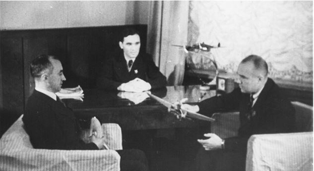 Заместитель Народного комиссара авиационной промышленности А.С. Яковлев принимает конструкторов В.Я. Климова (слева) и Н.Н. Поликарпова, декабрь 1940 года. Архив ОАО «ОКБ им. А.С. Яковлева».