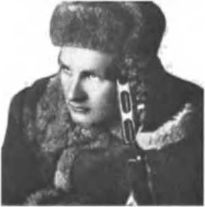 В. М. Кононов с российским флагом в руке. Однако уехать в Россию из буржуазной Латвии он отказался