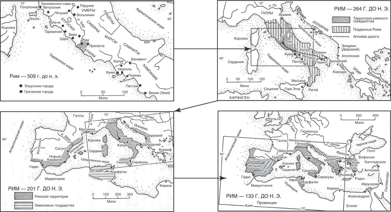 В течение первого столетия своего существования Рим был царством, возможно, подвластным этрускам, которые превратили его в главное государство западной части Центральной Италии. Примерно в 509 году до н. э. римская аристократия свергла царя, и Рим превратился в олигархическую республику. Непосредственным итогом стал временный упадок его господства, однако примерно с 400 года до н. э. его расширяющееся влияние привело к возрастающему доминированию над соседними территориями. К 264 году до н. э. Рим постепенно добился гегемонии над всем итальянским полуостровом.
