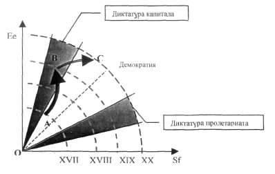Противоборство двух диктатур должно было привести к переходу на новый уровень развития и смещению общественного строя в зависимости от располагаемых экономических ресурсов развития в сектор либеральной или социальной демократии. Так и получилось – развитие Запада вдоль кривой (АВ), продолжавшееся с XVII по XIX в. и приведшее к установлению «диктатуры капитала», под влиянием «диктатуры пролетариата» в XX веке изменилось на движение вдоль кривой (ВС). Под влиянием этих сил Запад снова оказался в секторе Демократии, но уже образца XX века.