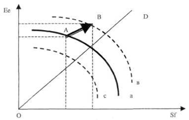 Одновременно происходит качественное изменение самой политэкономической системы, она переходит на следующий уровень развития. Продемонстрируем это утверждение на нашем графике: в результате повышения заработной платы происходит не просто экстенсивное развитие экономической системы, а ее качественный переход на новый более высокий уровень с «а» на «в», а точка равновесия сдвигается вверх и вправо из точки «А» в точку «В». Происходит одновременный рост экономической эффективности и социальной справедливости [Из графика также видно, что повышение заработной платы имеет свой предел, ниже которого экономическая эффективность начинает снижаться].