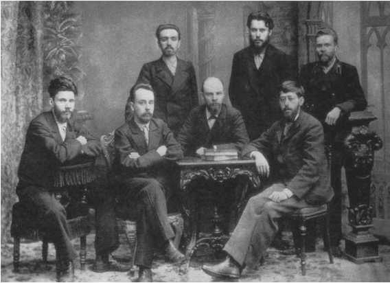 Руководители «Союза борьбы за освобождение рабочего класса» 1897 г. Стоят: Александр Мальченко, Петр Запорожец, Анатолий Ванеев. Сидят: Василий Стариков, Глеб Кржижановский, Владимир Ульянов (Ленин), Юлий Цедербаум (Мартов).