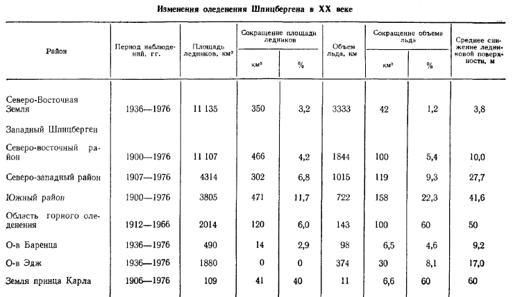 Из восьми выделенных в таблице районов в четырех, (а это по площади две трети от всего оледенения Шпицбергена) изменения оледенения характеризуются по двум временным периодам: с начала нашего века и до 1936 года и с этого года по 1976 год. В остальных районах данные по первому периоду отсутствуют, но их можно вывести по аналогии, поскольку известно, что сокращение оледенения происходило более или менее равномерно везде. Таким образом, подсчитано, что оледенение архипелага с начала века сократилось на две тысячи сто пятьдесят квадратных километров (по объему это составляет шестьсот пятьдесят кубических километров).