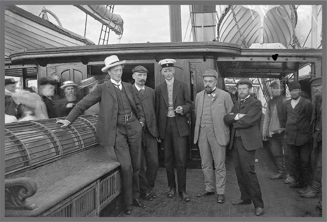В. А. Русанов (второй слева) на судне «Королева Ольга» во время возвращения из экспедиции на Новую Землю. 1910 г. (Из фондов ГААО)