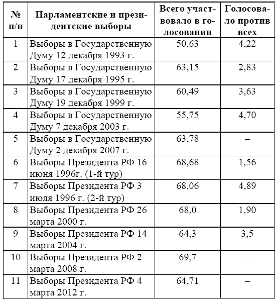 14. Уровень электорального участия россиян на общефедеральных выборах (в %) голосование против всех[52]