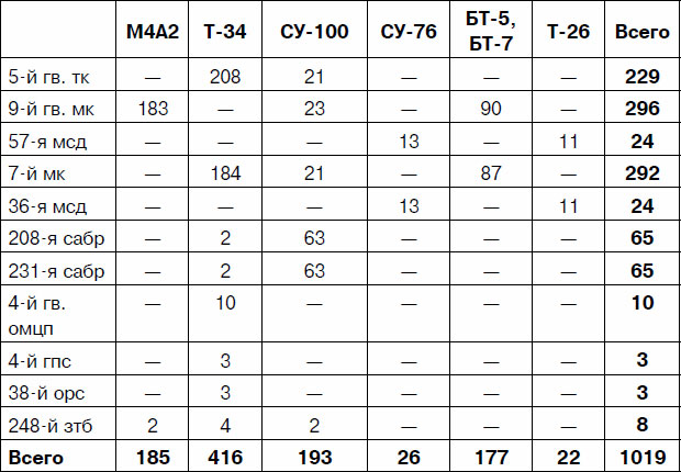 «…6-я гвардейская танковая армия в составе 9-го гв. мк, 5-го гв. тк, 7-го мк, 57-й мсд, 1141-го пап, 202-й олабр, 30-й зенад, 57-го гв. мп, 4-го гв. омцп, 36-й мсд, 208-й сабр, 231-й сабр, 624-го ап, 390-го и 388-го сап (СУ-100) к началу операции дислоцировалась в районе: