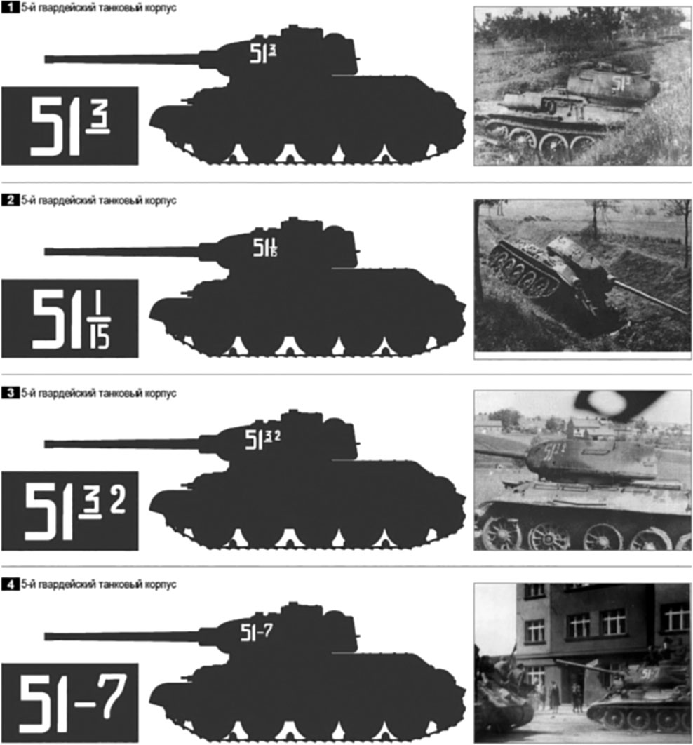 Схема 7. Опознавательные знаки, нанесенные на боевые машины соединений и частей 6-й гвардейской танковой армии с января 1944 г. по сентябрь 1945 г. 5-й гвардейский танковый корпус: на башню боевых машин наносились крупные цифры «51», мелкие цифры, обозначавшие принадлежность к корпусу, и мелкие цифры, иногда через дробь, обозначавшие принадлежность к бригадам, батальонам, ротам и т. д.