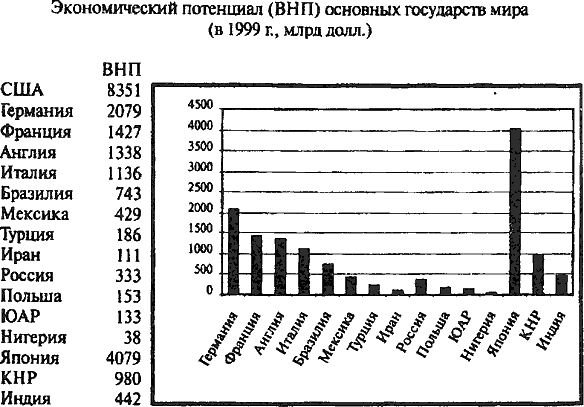 Что же касается России, то хотя ее экономический потенциал позволяет формировать «полюс» в рамках СНГ (вслед идущей за ней Украине, ВВП — около 38 млрд долл.), в целом ее экономический потенциал (ВНП), по которому она в 1999 г. занимала 16-е место в мире, а по ВВП на душу населения — 98-е (а если через ППС — 80-е место), не только не «тянет» на глобальность, но даже и на региональность. Ее место в локальном пространстве СНГ.