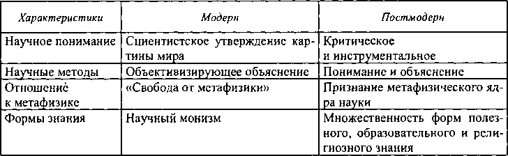 Немецкий философ и культуролог П. Козловски представил в таблице сравнительные характеристики модернистского и постмодернистского отношении к науке[266].