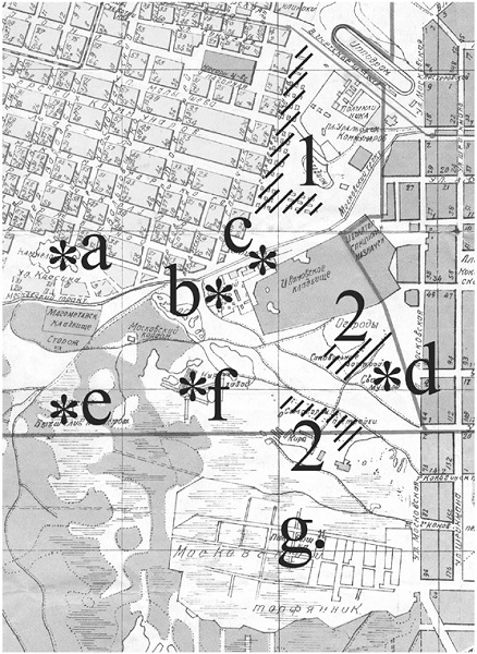 Карта восточной части Молотовского района г. Свердловска. Штриховкой обозначены участки: 1- барачной застройки, непосредственно прилегавшие к Площади Коммунаров; 2 – самовольной застройки в районе Московского торфяника. Именно в бараках в районе 1 проживал пропавший в сентябре 1939 г. Вова Петров. Использована карта 1932 г., поскольку после 1940 г. бараки в районе площади Коммунаров были в своём большинстве снесены и на их месте возведены: больница Верх-Исетского завода, электроподстанция и иные постройки, в силу чего карты последующих лет не позволяют получить представление о наличии и истинном расположении объектов на территории Молотовского района. Знаками * и буквами обозначены: a – каменоломни к северу от Московского тракта; b – собачий двор, куда свозили отловленных на улицах города бродячих собак; с – завод по обработке утильсырья; е – скотомогильник, территория которого ранее использовалась для слива городских нечистот; f – кирпичный завод; d – свалка мусора. Точкой g. обозначена пожарная вышка на Московском торфянике. Что и говорить, район пустынный и мрачный! Приведённая карта особенно интересна для нас тем, что на ней указаны зоны ответственности территориальных отделов Рабоче-крестьянской милиции: 4-го (кварталы слева вверху) и 1-го (по правому краю карты). Граница между ними обозначена сплошной непрерывной линией. Легко заметить, что площадь Коммунаров находится как раз на границе их зон ответственности.