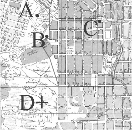 Карта восточной части Молотовского района г. Свердловска, позволяющая составить представление о перемещениях Вовы Петрова после его исчезновения около полудня 12 сентября 1939 г. Использован фрагмент карты 1932 г. как более точно передающей специфику застройки и городской инфраструктуры, нежели карты, датированные после 1940 г. Обозначено: А – место проживания мальчика в бараке №1 на пл. Коммунаров, возле которого мальчика в 11:20 в последний раз видели мать и братья, в 12:45 именно от этого места начались его розыски; В – сквер по ул. Репина, дом №4, в нём около 12 часов Мария Вяткина видела мальчика, в котором узнала Вову Петрова, мальчик был один; С – площадь 1905 г., на которой пропавшего мальчика независимо друг от друга около 13 часов или несколько позже видели Михаил Кириллов и Лиза Бухаркина. Свидетели хорошо знали мальчика и исключали ошибку опознания, по их хорошо согласующимся показаниям Вова Петров шёл в обществе крупной женщины в пальто, двигался он в направлении улицы 8-го марта, т.е. удалялся от места проживания. D – место обнаружения трупа Вовы Петрова в районе Московского торфяника Еленой Бурениной и Дарьей Стерлиговой около 17 часов 12 сентября (т.е. спустя 5 или даже менее часов с момента исчезновения ребёнка). Место показано условно, поскольку в официальных документах нет точной привязки к ориентирам на карте, а содержится лишь невнятное указание на местонахождение трупа в районе мыловаренного завода (причём, расстояние до него также не указано). Расстояния от А до С примерно 1,5 км., от В до С – примерно 1,2 км., от А до D – неопределённо, поскольку точное положение D неизвестно, но никак не менее 2 км. по прямой, от С и D – тоже неопределённо в силу означенной причины, но при любых условиях больше расстояния между А и D. Все поименованные точки однозначно связаны с Вовой Петровой и его присутствие в этих местах в указанное время не вызывает сомнения. Однако, при взгляде на карту нельзя не заметить труднообъяснимую разбросанность отмеченных мест. Все они взаимно удалены на значительные расстояния и вызывает большие сомнения возможность маленького мальчика (его возраст 3 годика!) самостоятельно такие расстояния преодолевать. Можно допустить, что Вова сам ушёл от дома к скверу у тюрьмы и похищение произошло именно там, а вовсе не возле дома. В этом случае направление движения похитительницы, замеченной на площади 1905 г. свидетелями Кирилловым и Бухаркиной, уводившей ребёнка прочь от места следует признать вполне логичным. Однако, дальнейшее движение похитительницы представляется в высшей степени страннным. Кажется невероятным, чтобы хорошо одетая женщина (в обуви на каблуках!) лично повела жертву на торфяник с целью убийства. Кроме того, много вопросов рождает мотивация действий женщины-убийцы. Хотя феномен женщин-детоубийц существует, всё же, совершаемые ими преступления обычно совершенно иного типа, нежели то, что мы видим в данном случае. Использование ножа в качестве орудия убийства также заставляет усомниться в том, что умерщвление осуществлялось женщиной. И хотя присутствие женщины на месте убийства полностью исключать нельзя – след обуви маленького размера вполне мог принадлежать именно ей – всё же, в данном случае чувствуется рука убийцы мужского пола. Однако, это допущение заставляет предположить сговор, по меньшей мере, дв