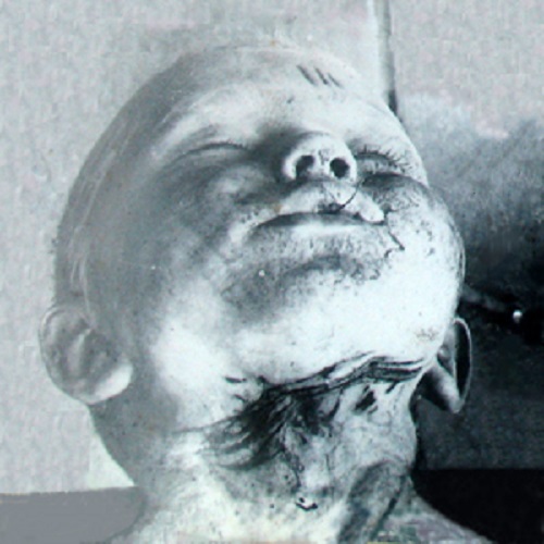 – на боковых поверхностях шеи 7 поверхностных надрезов кожных покровов, все они почти горизонтальные на уровне подъязычной кости от одного угла нижней челюсти к другой. Длина надрезов от 7 до 12 см, подкожную жировую клетчатку надрезы не достигают (поз.2);