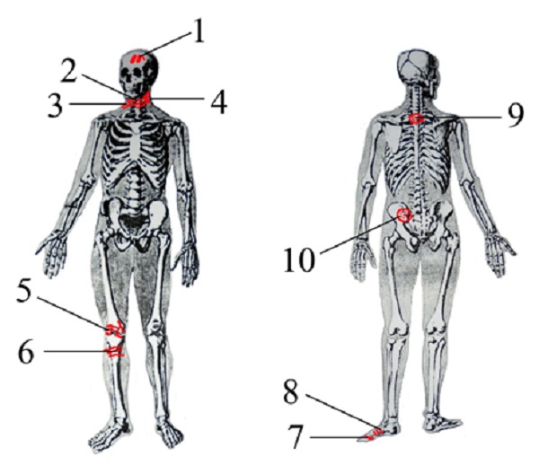 При внешнем осмотре зафиксированы следующие телесные повреждения (см. анатомическую схему) :