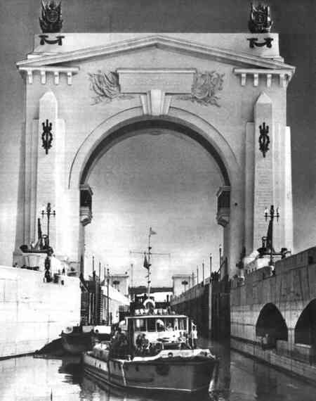 Триумфальная арка, венчающая вход в Волго-Донской судоходный канал им. В.И. Ленина. Волгоград. 1952 год