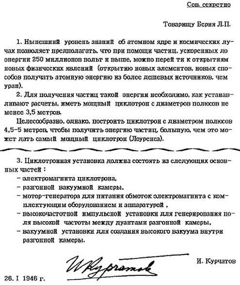 Письмо И.В. Курчатова Л.П. Берии (датировано 26 января 1946 года), где предлагается для развития физических исследований создать мощный циклотрон, который позволил бы получить энергию частиц выше, чем на самом мощном из имеющихся на тот момент в мире ускорителей — циклотроне Лоуренса