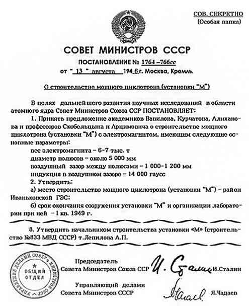 Постановление Совета министров СССР от 13 августа 1946 года № 1764-766сс «О строительстве мощного циклотрона (установки «М»)»