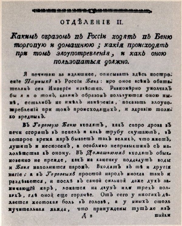 29-я страница книги о русских банях, не которой начинается второе «отделение» (глава) — обстоятельный рассказ о том, как в России пользуются баней