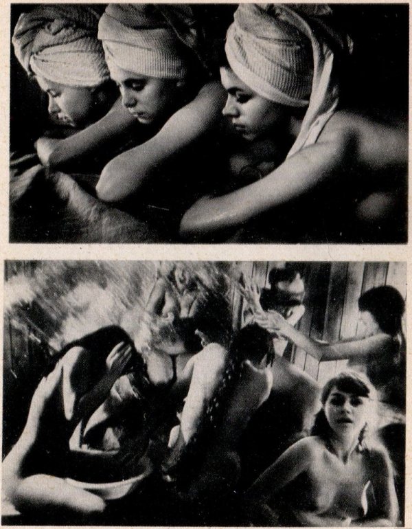 Из обоих залов — готического и восточного все одинаково голые шли в мыльню. Просторно, каменные скамейки. На возвышении, как на трибуне, три ванны. Против них — шесть душей. Один бьет сильно, не жалеючи, — для здоровых людей. Второй чуть слабее — для менее здоровых. А шестой и просто едва стекал, мягко и ласково.