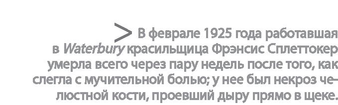 На самом деле тому могла быть и другая причина, хотя в часовой компании этого никогда бы не признали. В феврале 1925 года работавшая там красильщица по имени Фрэнсис Сплеттокер умерла всего через пару недель после того, как слегла с мучительной болью; у нее был некроз челюстной кости, проевший дыру прямо в щеке. Официально с работой ее смерть никто не связывал, однако некоторые ее коллеги сделали выводы. Одна из девушек в Waterbury сказала, что страшно испугалась, когда Фрэнсис умерла, и больше ни за какие деньги не станет работать в отделе росписи циферблатов.