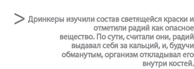 Дринкеры методично прошлись по всем ингредиентам краски, по очереди исключая каждый как нетоксичный, однако по поводу радия признали наличие достаточных доказательств опасности его чрезмерного воздействия. «Единственным входящим в состав светящегося материала веществом, которое способно причинить вред, – заключили Дринкеры, – является радий».