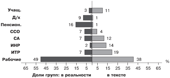 В этом исследовании в технике интервью задавался вопрос: «Случалось ли, чтобы когда-либо о Вас писали газеты, чтобы Ваше имя упоминалось бы в передачах радио или ТВ?» Вопрос фиксировал положительные ответы отдельно по всем видам и уровням СМИ, и оказалось, что городская газета (если опрашиваемый говорит о периоде в последние 5 – 7 лет, а больше он не запомнит) писала о 10 % взрослого населения города. Структура этих 10 % по «квотированной» выборке довольно точно соответствовала структуре «героев» текста за четыре месяца (7831 упоминание): рабочие – 30 %, ИТР – 17%, непроизводственная интеллигенция (ИНП) – 17%, служащие аппарата предприятий и учреждений (СА) – 13 %, служащие сферы обслуживания (ССО) – 11 %, пенсионеры – 2%, домохозяйки – 1 %, учащиеся – 9 % (ср. с рис. 6.8). Если же перевзвесить «квотированный» массив опрошенных на общегородские пропорции населения по признакам «род занятий x пол x образование», то распределение примет вид: рабочие – 64 %, ИТР – 8 %, непроизводственная интеллигенция (ИНП) – 3 %, служащие аппарата предприятий и учреждений (СА) – 7 %, служащие сферы обслуживания (ССО) – 5 %, пенсионеры – 8 %, домохозяйки – 2%, учащиеся – 3 %. Здесь картина ближе к реальной структуре взрослого населения города по всем группам, кроме преобладания в полтора раза рабочих, уменьшения вдвое доли пенсионеров и вчетверо домохозяек.