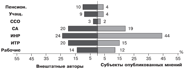 Рис. 6.9. Структура субъекта выраженного общественного мнения по проблемам городской жизни (оценка, мнение, предложение) с точки зрения рода занятий; n = 1956 (без групповых субъектов – 6,6 % и неясных ситуаций с родом занятий – 4,3 %); и в сравнении со структурой института внештатных авторов городской газеты; n = 502[159]