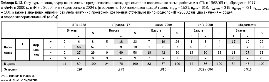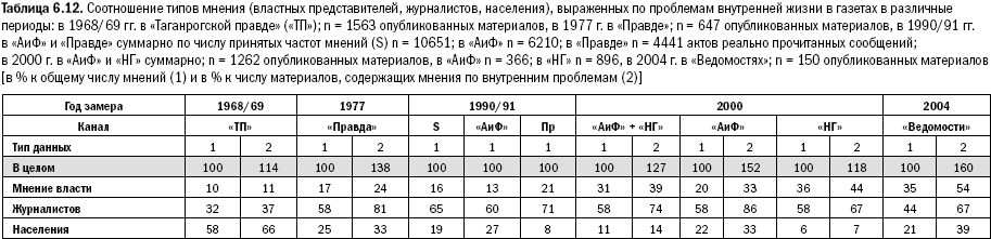 3. В колонках, фиксирующих опубликованные мнения относительно числа сообщений (материалов) процент больше 100. Эти 14 % сверх сотни у «Таганрогской правды» 1968/69 гг., 38 % у «Правды» 1977 г. 52 % – у «АиФ» 2000 г., 18 % – у «НГ» 2000 г. и 60 % – у «Ведомостей» 2004 г. говорят о пересечении в одном материале (публикации) различных пластов мнений и журналистов, и власти, и рядовых авторов (при единице измерения материал, сообщение). Здесь удельные веса совместных частот мнений различных слоев могут сказать об ориентации этих слоев друг на друга.