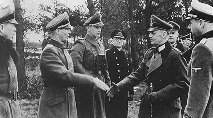 Фельдмаршал фон Рундштедт пожимает руку Карлу Бартлингу, командиру III дивизиона 12-го артиллерийского полка СС