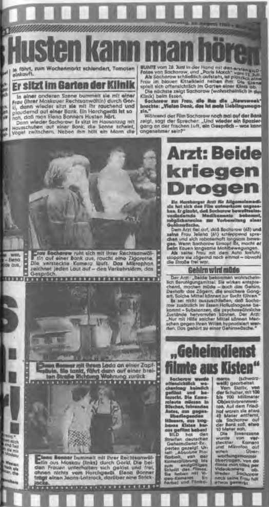 Из другого документа КГБ от 20 июля 1985 г.: «Сразу же после возвращения мужа [из больницы] Боннэр приступила к его массированной психологической обработке, в резкой форме обвинила его в преждевременной выписке, заявив, что рассчитывала на его пребывание в больнице в течение «полугода, а может быть и года». В целях публичного разоблачения… инсинуаций о Сахарове Комитетом госбезопасности оперативным путём был создан документальный видеофильм, объективно отражающий пребывание Сахарова в больнице, содержащий эпизоды самостоятельного приёма им пищи, работы с научной литературой, регулярных медицинских обследований, просмотра телепередач, чтения советской и зарубежной прессы, оживлённых бесед с соседом по палате».