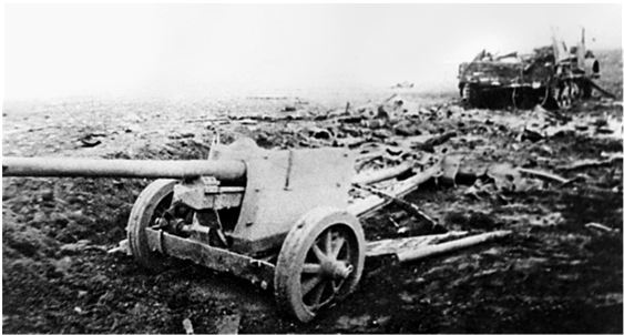 Брошенная противотанковая пушка ПАК-40 и ее тягач. Удары советской авиации мешали организованному отходу немецких войск