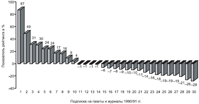 Рис. 3.11. Условный рейтинг газетной и журнальной периодики при подписке в период 1990/1991 гг. (по данным Союзпечати и с учетом изменения цен и падения объемов аудитории; на шкале от -100 до +100 условных процентов)