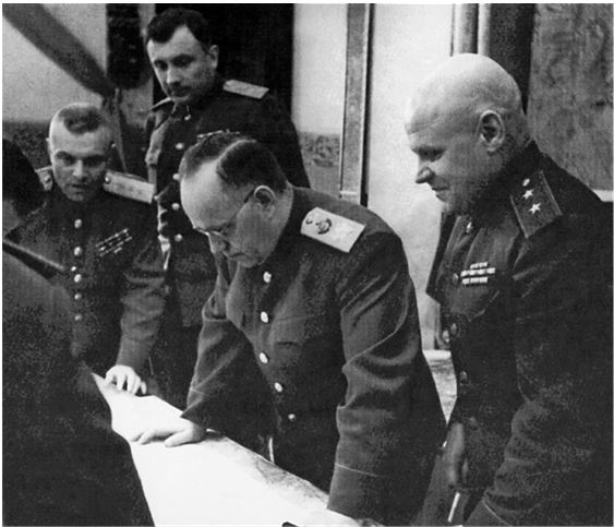 Командующий 1-м Белорусским фронтом Г. К. Жуков изучает обстановку по карте
